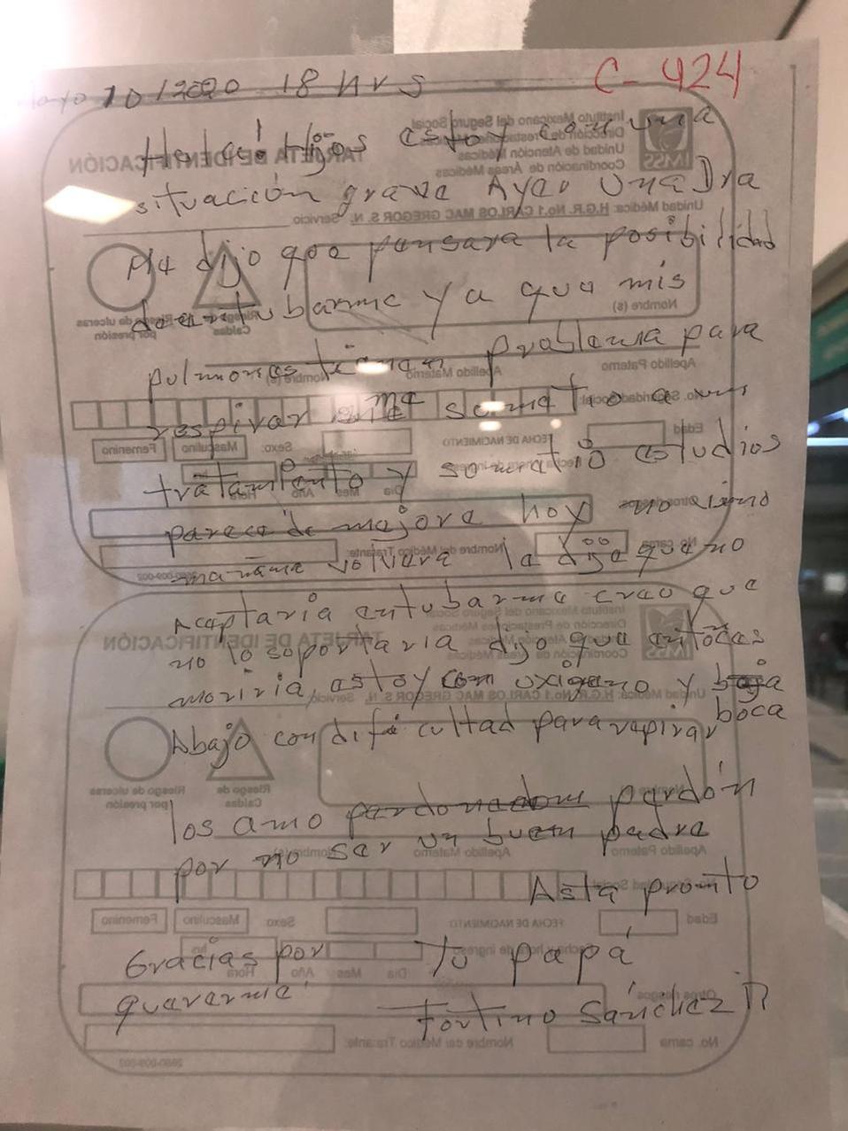 El paciente de la cama 424 decidió rechazar la intubación, lo que para todo fin práctico significaba que había decidido morir. Sus últimos momentos los destinó a despedirse de sus hijos a través de un mensaje plasmado en una simple hoja usada de control médico.