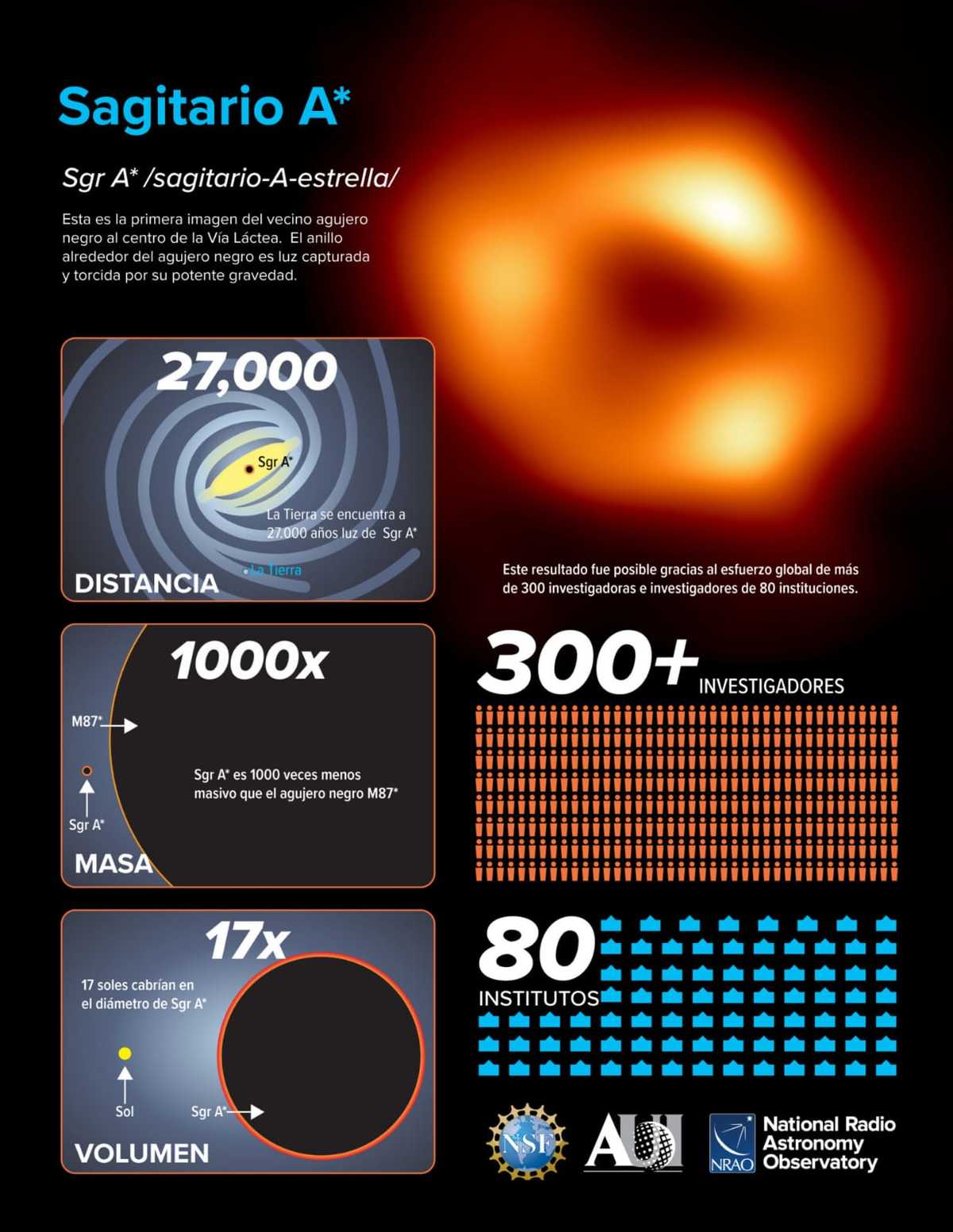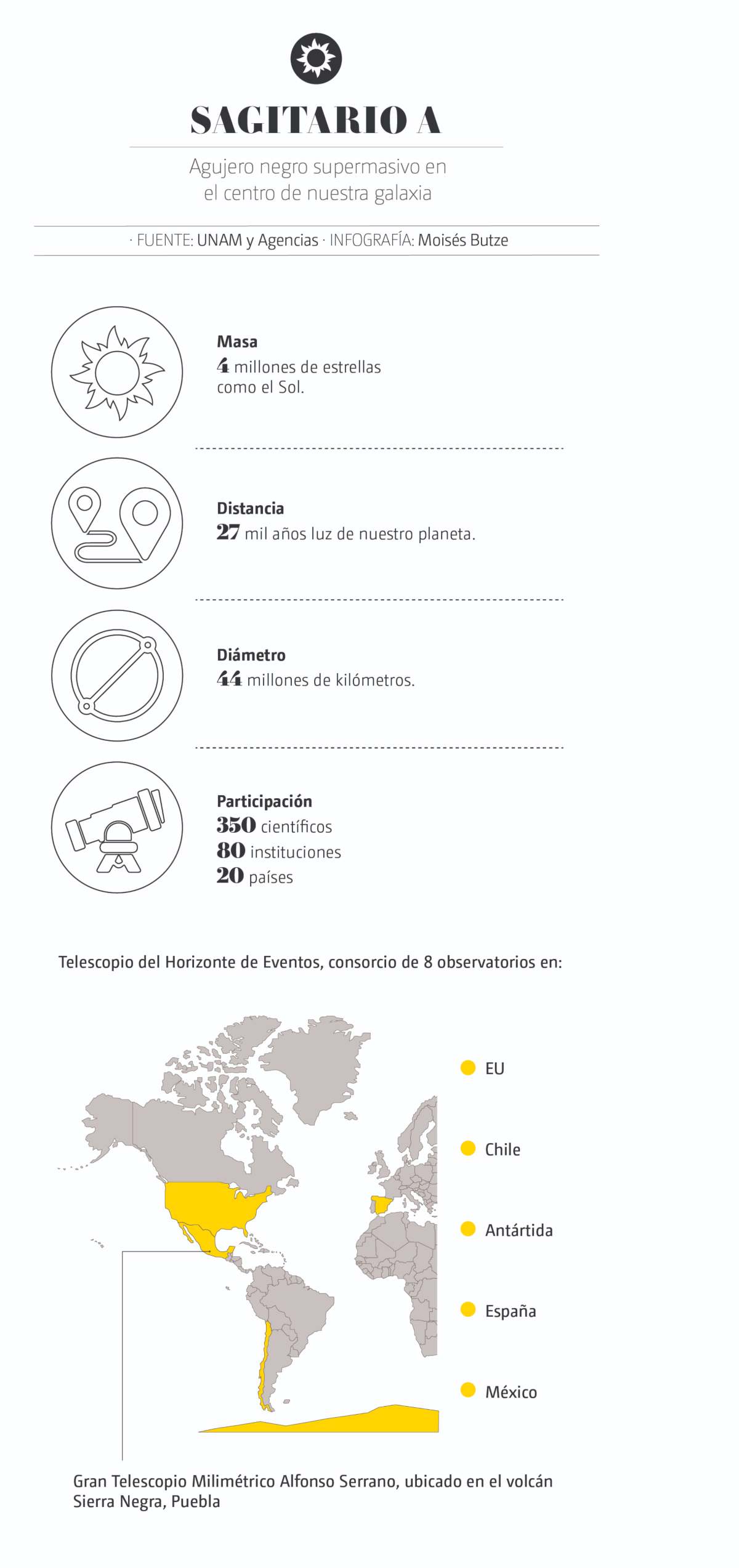 Se trata de Sagitario A estrella (Sgr A*), una masa espacial con un anillo brillante y una región oscura llamada “alfombra del hoyo negro”, que se encuentra a 27 mil años luz del planeta Tierra. La doctora Gisela Ortiz León, investigadora del Instituto de Radio Astronomía y Astrofísica de la UNAM, explicó que el diámetro de este anillo depende exclusivamente de la masa del hoyo negro, esto quiere decir que mientras más masivo, mayor es el diámetro y la sombra.
