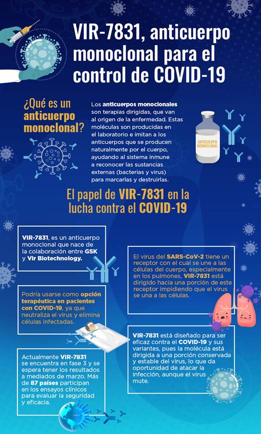 GlaxoSmithKline y Vir Biotechnology desarrollaron los anticuerpos monoclonales “VIR-7831” con base en una plataforma de investigación ya existente para el Síndrome Respiratorio Agudo Grave, lo que permitió acelerar los estudios para el desarrollo de la molécula dirigida específicamente contra SARS CoV-2, señaló Sigfrido Rangel.
