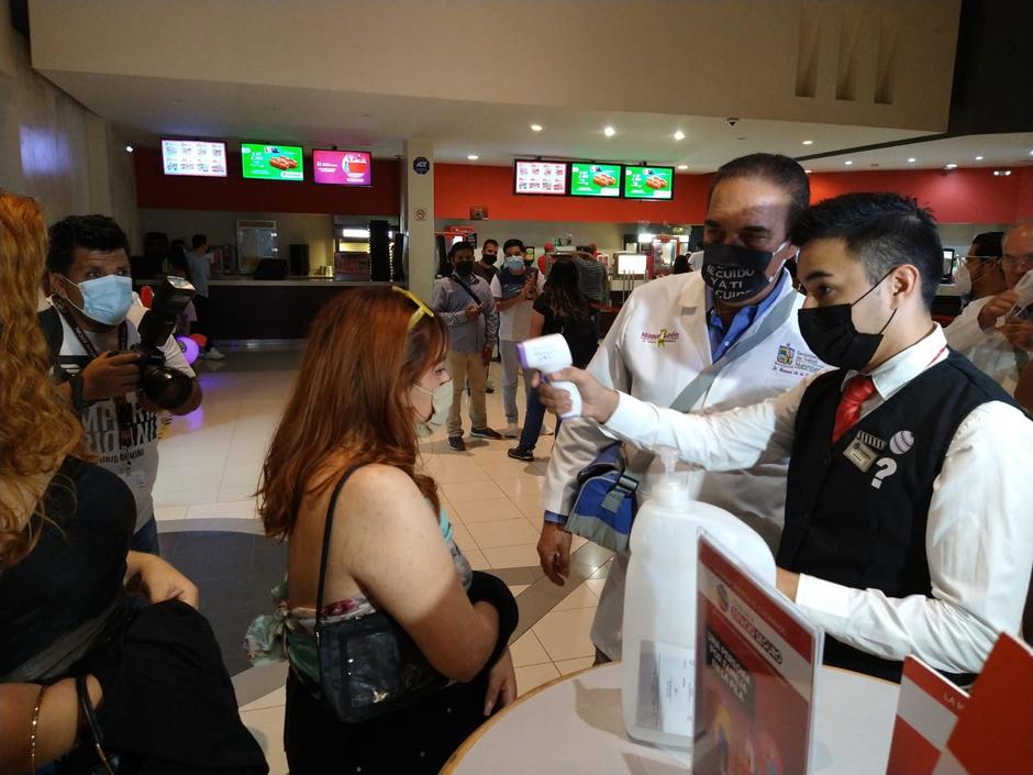 El secretario también fue recibido de forma alegre por algunos comensales y espectadores de la sala de cine.