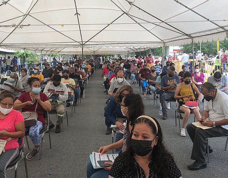 Entre largas filas y horas de espera, sigue la vacunación contra covid-19 en Monterrey