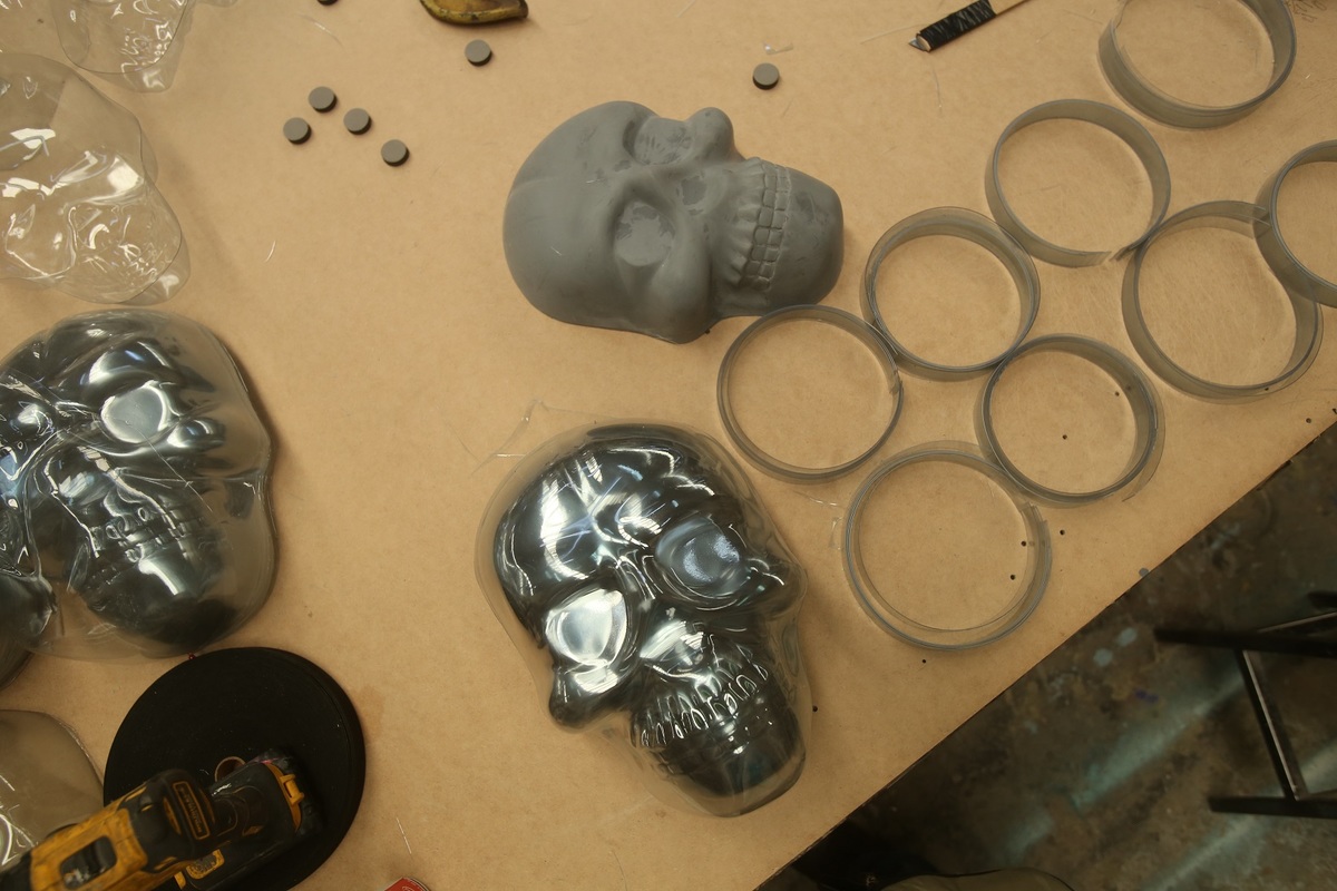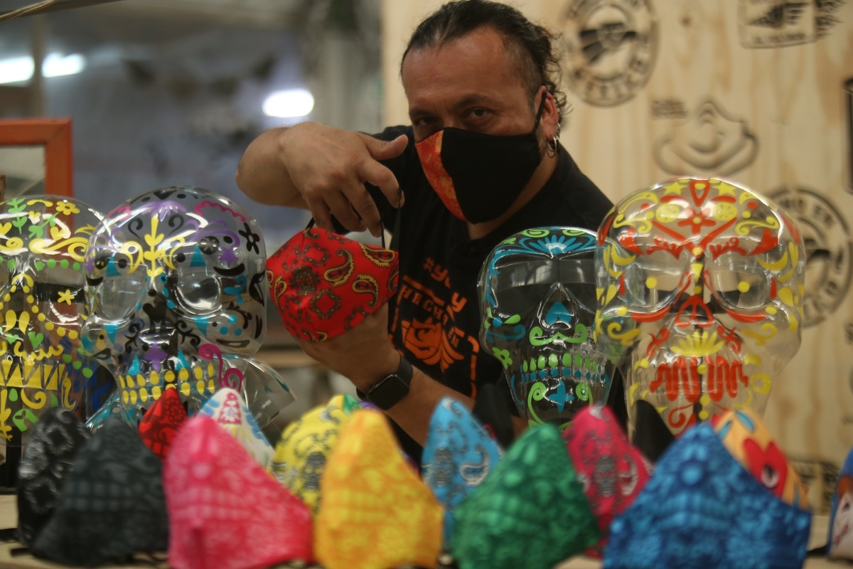 Para una mejor protección los también diseñadores crearon caretas protectoras para evitar el contagio de covid-19, con forma de cráneos y decoradas como catrín y catrinas; se hacen alrededor de 300 caretas diarias.