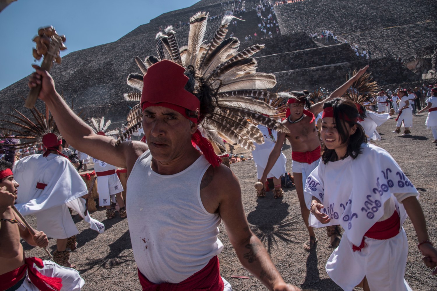 Miles de personas se reúnen en la enorme pirámide del Sol, algunos se visten de blanco, por la creencia de que así se cargarán de energía positiva y eliminarán las malas vibras. Con mucho esfuerzo suben los 238 escalones que llevan a la cima de la pirámide, donde levantan los brazos hacia el cielo.