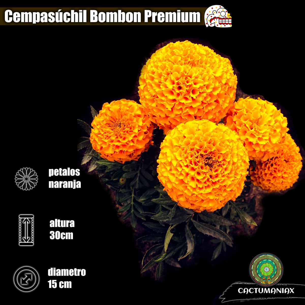 El tallo de la flor de Cempasúchil puede llegar a medir hasta medio o un metro de altura, mientras que sus botones pueden alcanzar los 15 centímetros de diámetro.