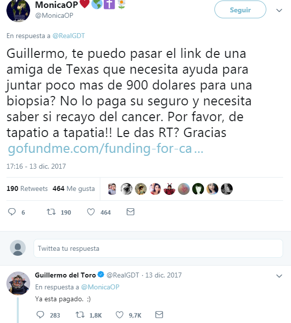 No sólo la educación mueve a este talento mexicano en 2017 una usuaria de Twitter @MonicaOP le solicitó al director que retuiteara un mensaje para que su amiga Cassie Hollingsworth pudiera recibir donaciones y de esa forma pagar la biopsia que necesitaba para averiguar si el cáncer había vuelto, Guillermo no retuiteó el mensaje sino que donó 665 dólares que faltaban para que Cassie pudiera realizarse el examen, demostrando que la salud es una causa que también conmueva al cineasta.