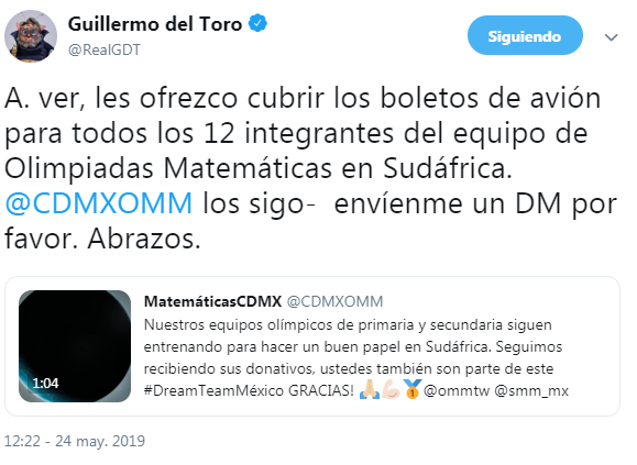 Hace unos meses la Sociedad Matemática Mexicana (SMM) tuiteó pidiendo donaciones para ir a competir a la Olimpiada Internacional en Sudáfrica, solo eso fue necesario para alertar al director tapatío quien ni tardo ni perezoso se hizo presente y a través de su cuenta oficial de Twitter se ofreció a pagar los 12 boletos de avión para los participantes.