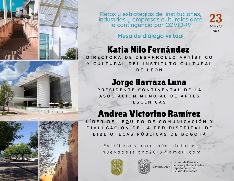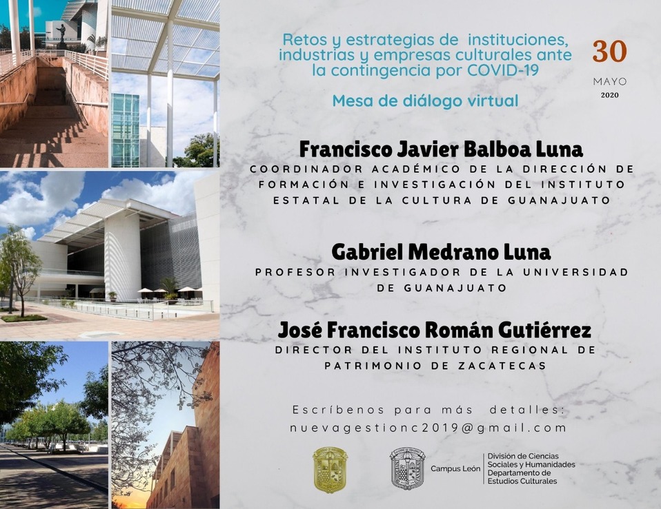 Con el objetivo de crear un espacio de reflexión entre profesionales e interesados en el quehacer artístico y cultural, alumnos de la Universidad de Guanajuato, campus León adscritos a la maestría en Nueva Gestión Cultural en Patrimonio y Arte llevarán a cabo por dos días una mesa de diálogo virtual, titulada: “Retos y estrategias de instituciones, industrias y empresas culturales ante la contingencia por el COVID-19”.