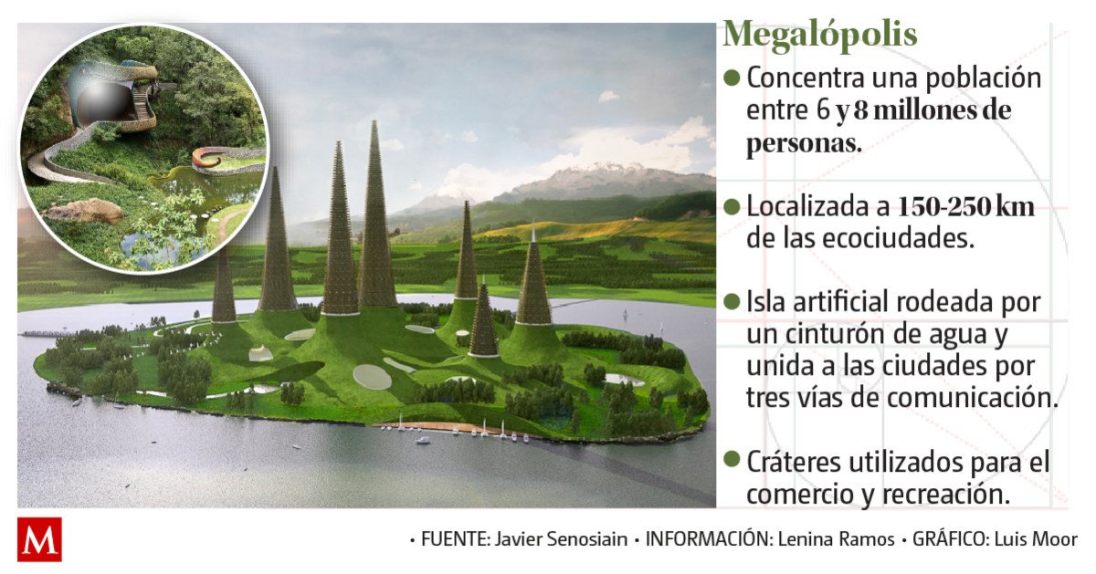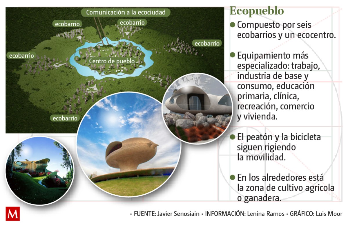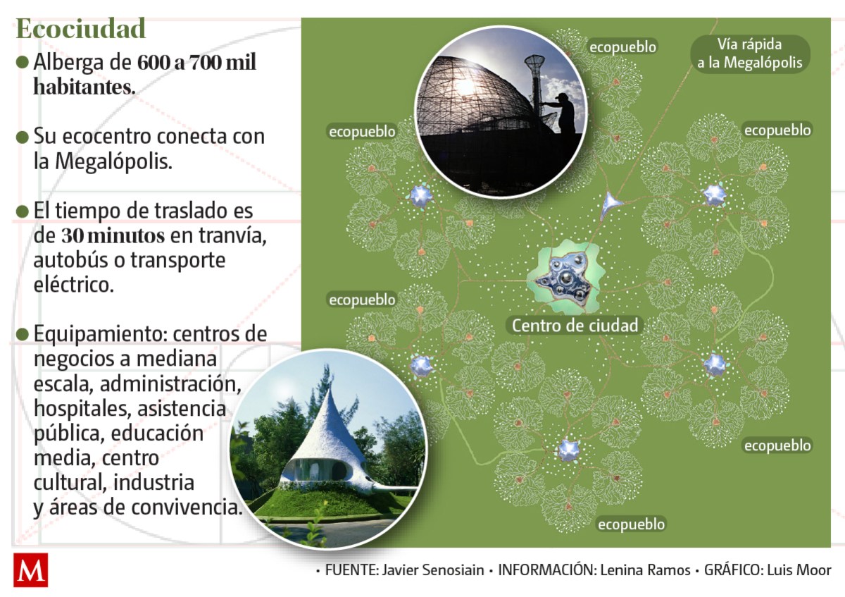 Los Ecobarrios formarían Ecopueblos, con un centro con mayores servicios, como comercios y escuelas, entre otros. Seis Ecopueblos formarían una Ecociudad, y seis Ecociudades conformarían una Megaecociudad.