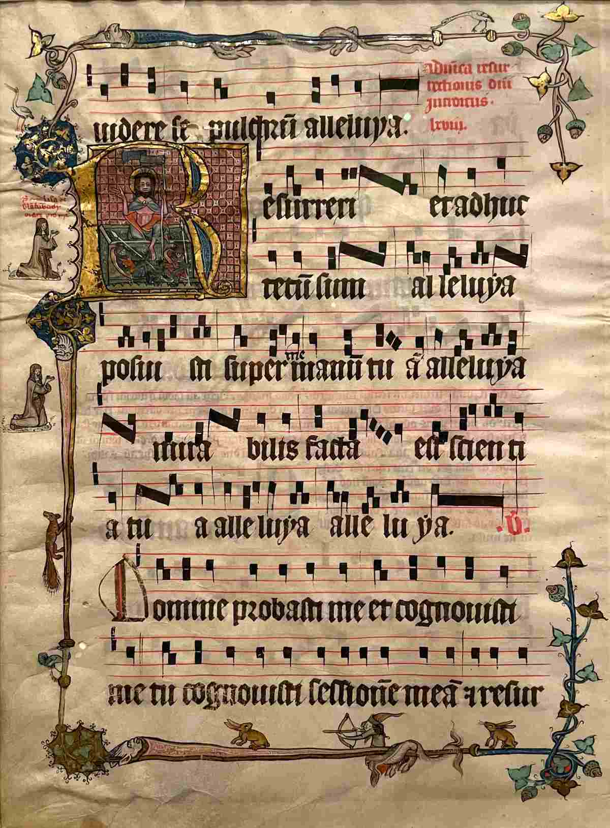 Imagen tomada en el Museum Schnütgen del manuscrito titulado "R inicial con la Resurrección de Cristo", hoja suelta de un gradual (libro de cantos para misas católicas) de dos volúmenes, de la escriba Loppa von Spiegel, Convento de Santa Clara, Colonia, ca. 1360. Wallraf-Richartz-Museum & Fondation Corboud, Inv. M 7.