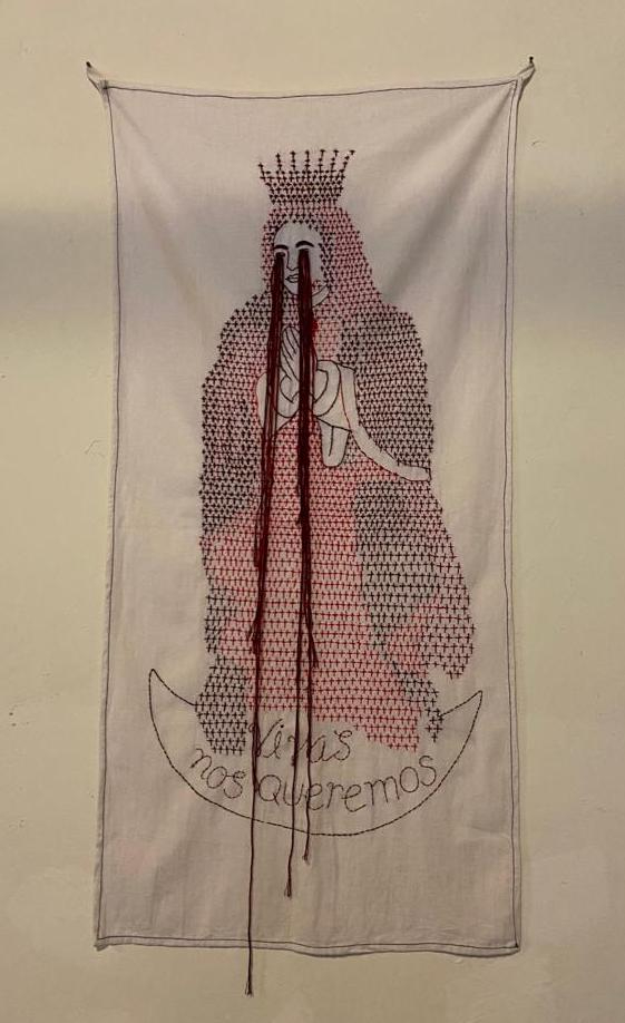 Ahí están de igual manera los trabajos de arpilleras chilenas confeccionados durante la dictadura; la instalación sonora realizada ex profeso para recordar a Alicia de los Ríos Merino, desaparecida de manera forzada durante la Guerra Sucia en la década de 1970; los rótulos tejidos a gancho por la colectiva Xico Tejedoras Urbanas; la mancha roja en expansión tejida por la Colectiva Hilos y el estandarte 3650 de Zeltzin Nieto Mata (1986), quien bordó diez figuras femeninas al día durante un año, que suman y muestran los 3650 feminicidos cometidos en 2020.