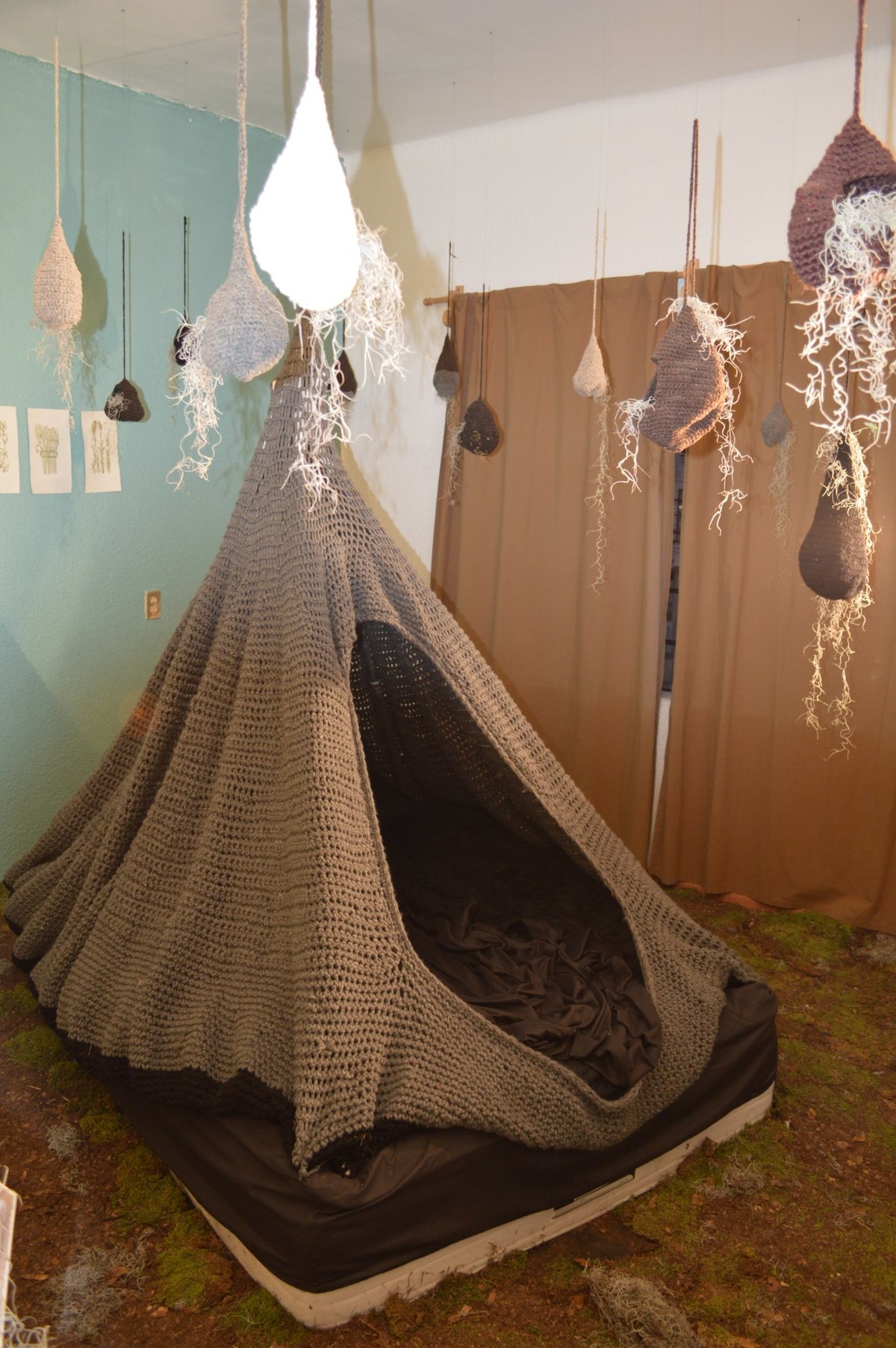 En esta misma línea, Julia Caporal (1973), artista e investigadora del Instituto de Artes de la Universidad Autónoma del Estado de Hidalgo, teje el espacio. Su pieza Nido-Cama (que ocupó una habitación del Hostal Casa Viajero, en Pachuca, Hidalgo) es un eco de la gráfica expandida. En 2010 experimentó los primeros coqueteos con lo textil y la sugerente pieza intervenida Cortina se exhibió en las vitrinas del metro Pino Suárez. Si bien Caporal empezó a tejer como una exploración formal, muy pronto descubrió, entre lazada y lazada, la potencial conjunción de dos técnicas: tejido y grabado. La instalación está compuesta por un nido de 2 metros de diámetro por 1.50 de alto y quince nidos pequeños que la artista tejió durante tres meses. Al entrar a la pieza, el espectador anida como las aves y habita el nido como forma, objeto, función, sensación y concepto.