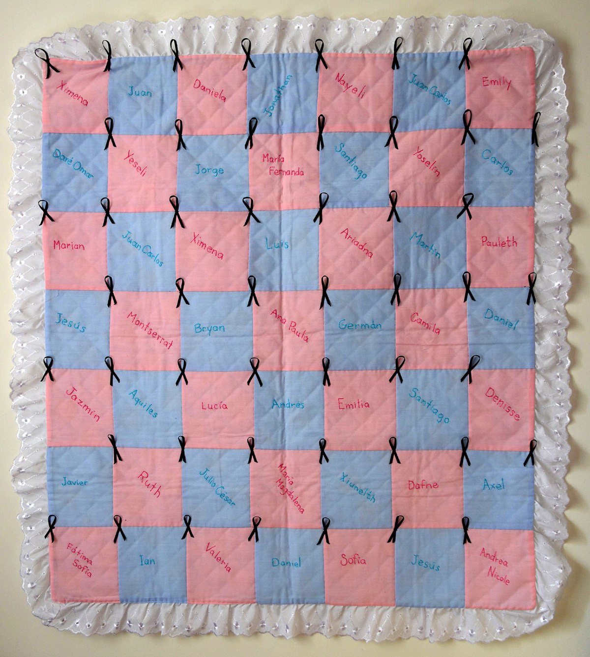 Este a-bordarnos se ha ido replicando en distintos puntos de México y del mundo. Uno de esos pilares es el impulsado, en 2012, por la artista Rosa Borrás (1964) en Puebla, donde ha creado “hermandades del hilo” como la que la une con Mabel Arellano (1987). Si bien el punto de encuentro entre estas dos artistas fue inicialmente la gráfica, han ido confeccionando relaciones interdisciplinarias que narran historias que comprueban el poder de las agujas. Borrás lo vivió con el que considera su primer bordado político: una cobija dedicada a los y las bebés de la Guardería ABC. Al marchar en el tercer aniversario del incendio, confirmó lo que ya sabían nuestras abuelas: los bordados y tejidos transmiten ideas y hechos de una forma sensible; de hecho, como ha comentado la artista: “son un gran medio, es distinto a ver la misma información en las noticias”.