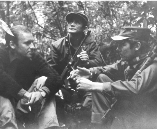 Hemos descendido una montaña y ascendido otra y así muchas veces; no es fácil ubicar a esta patrulla, movilizada en misión de exploración muy lejos de su zona tradicional de operaciones. El guía, un indio siempre callado, nos abandona por unos instantes: trepa la cuesta hacia la cumbre, cerrada de maleza entre los altos árboles, para indagar ciertas señales en las montañas vecinas. Encendemos cigarrillos, mis dos acompañantes, dos guerrilleros, y yo. Estamos sentados sobre troncos caídos, en un pequeño claro. Alguien cuenta una broma. Aspiro el humo, descubro que el cansancio no me cierra los párpados; quizás, porque la noche no ha terminado de irse y el frío es todavía más fuerte, aquí en lo alto, que el cansancio. El guía vuelve con buenas noticias. No nos queda más que una hora de marcha.