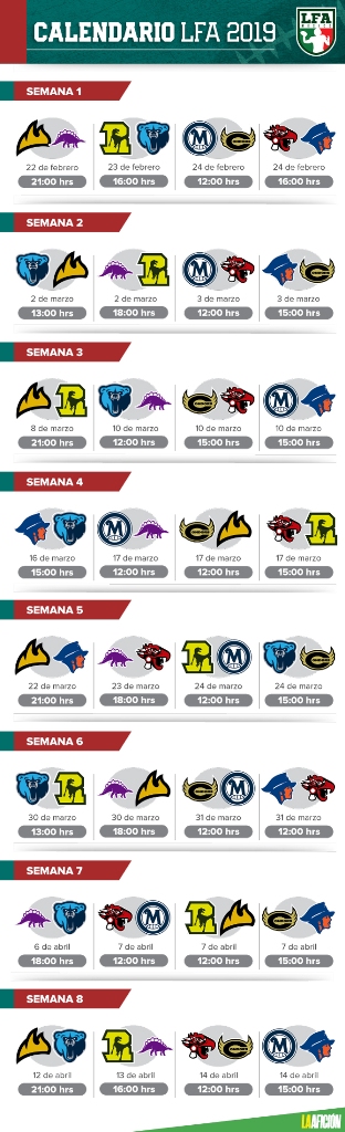 El primer partido de esta organización deportiva será entre Fundidores de Monterrey recibirán a los Dinos de Saltillo. El sábado 23, los Raptors del Estado de México medirán fuerzas con los Osos de Toluca.