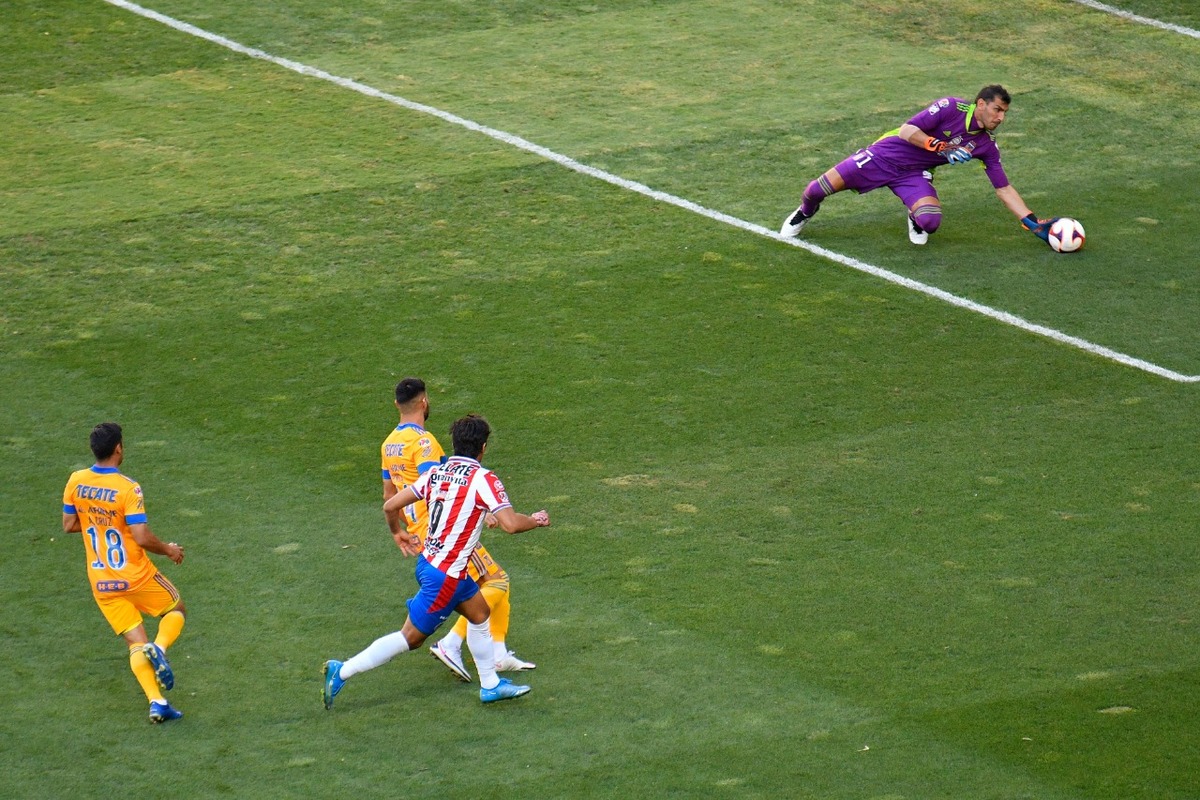El primer tiempo fue en tono rojo y blanco. Chivas fue más que los Tigres, pero no que Nahuel Guzmán. El portero bajó la cortina y perpetuó el empate en el primer lapso.