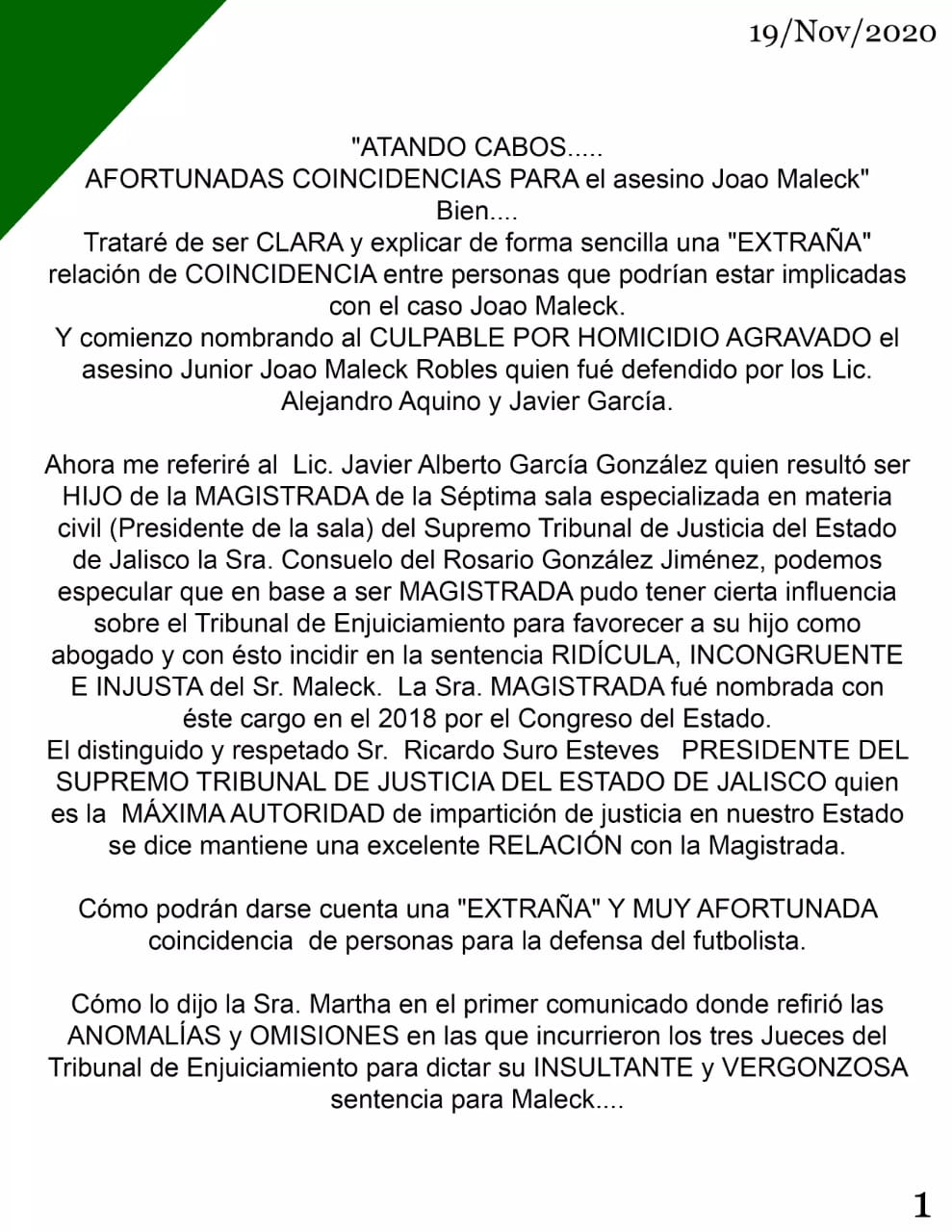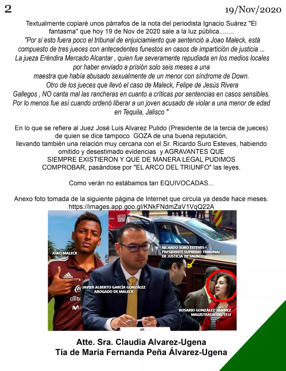 Ahora es la tía de María Fernanda, Claudia Álvarez Ugena, la que emitió un comunicado sobre la resolución que emitió un Tribunal de Enjuiciamiento en contra del jugador del Club Santos Laguna, Junior Joao Maleck Robles.