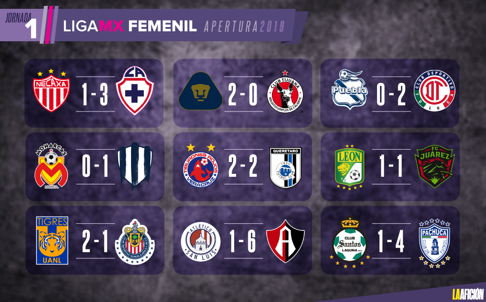 A continuación podrás revisar todos los resultados de la primera jornada del AP19 correspondeinte al balompié rosa mexicano.