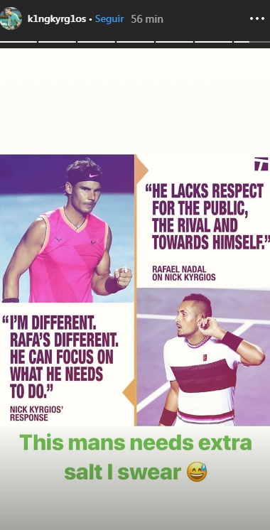 Además, Nick Kyrgios compartió un post con el video de su triunfo sobre Nadal, mismo que acompañó con el texto: ”Puedo oler su sangre cuando juego contra él”.