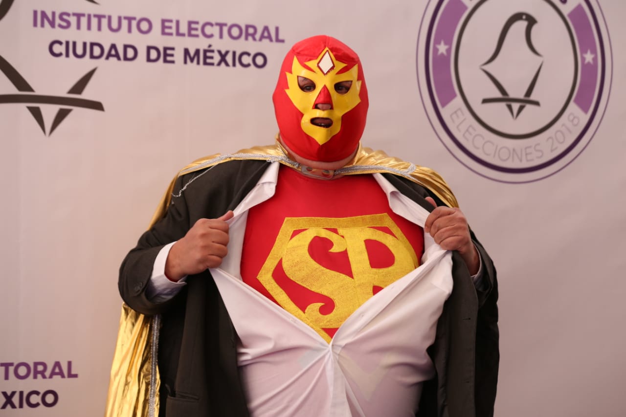Llega Marco Rascón, candidato del Partido Humanista, vestido de Súperbarrio y promete una reconstrucción de la ciudad al 100 por ciento.