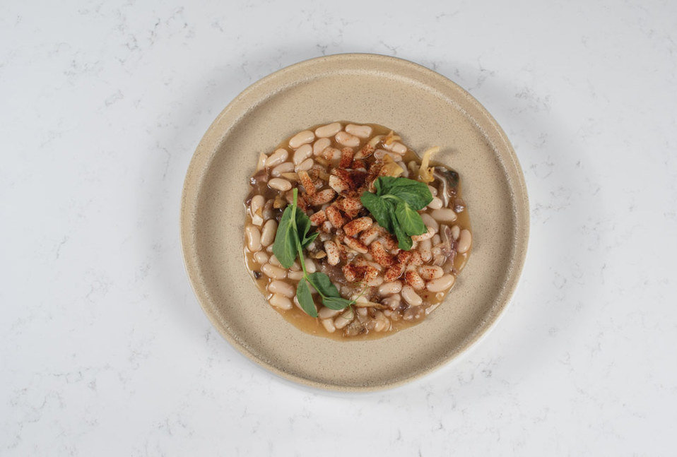 Un arroz meloso, a base de codillo de cerdo, salsa de soya, aceite de oliva, alitas de pollo, oreja de cerdo y setas. “Este platillo representa la esencia de lo que es Noso; tiene pocos elementos, pero mucho sabor. También intentamos elegir una parte del cerdo que fuera menos habitual y que en boca fuera muy golosa”.