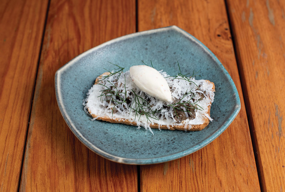 Hongo porcini, aceite de oliva, eneldo, setas, zanahoria, pimiento verde, queso mascarpone, pepperoni, grasa de cerdo y crema batida, todo en una tostada melba. “Alguna vez me metieron en la cabeza que uno de los mejores platillos que podemos degustar es pan y aceite de oliva, así que hice una recreación del concepto”.