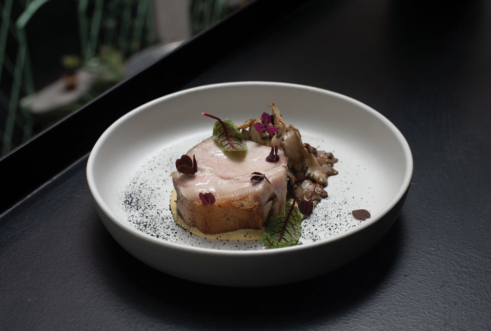 Lomo de cerdo, hongos, piloncillo, elote tatemado y manteca de cacao forman este novedoso platillo. “Llevaba varios meses trabajando esta receta; quería hacer algo rico, balanceado y con solo cinco elementos. No quiere decir que sea simple, hay mucho trabajo detrás. Es un plato de elementos simples, con sabores muy brillantes”.