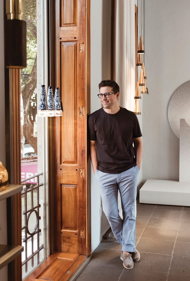 Estamos sentados en su showroom de la colonia Roma, en un edificio de principios del siglo XX con techos altísimos. Sus lámparas se exhiben de una manera muy artística junto al material con el que fueron creadas. Tres jóvenes que hablan en español y alemán están metidos en sus computadoras y resolviendo asuntos por teléfono; es parte del equipo de David Pompa que tiene oficinas en México y Austria. De hecho, llegó hace un par de días para Design Week.