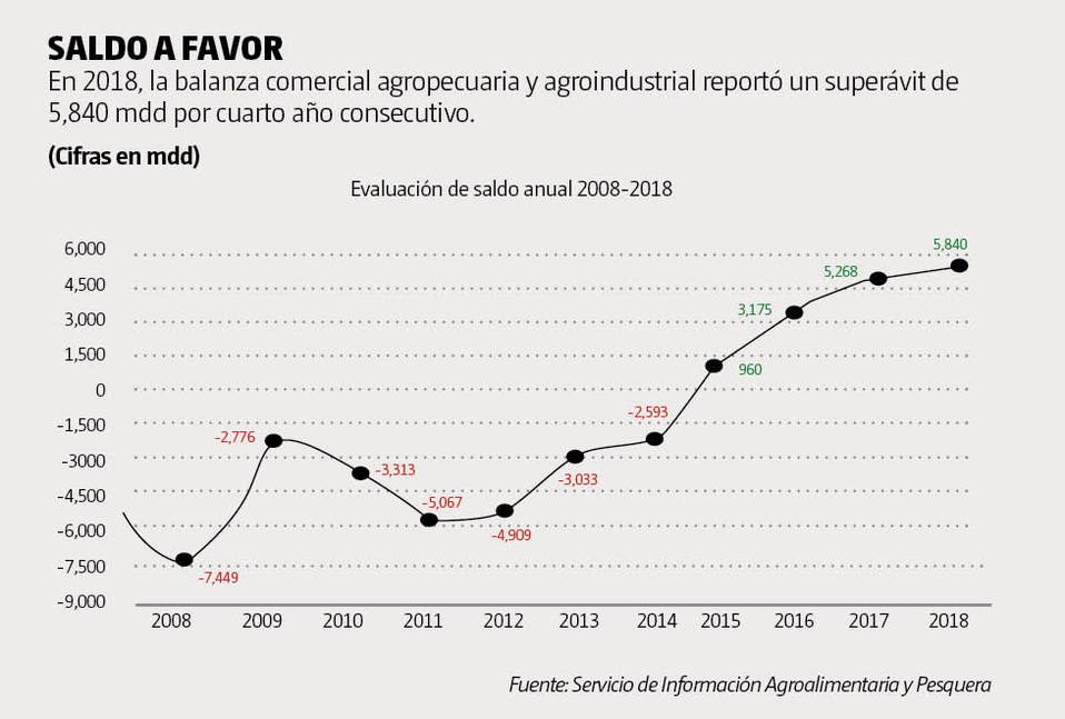 Asimismo, los productos agrícolas se han convertido paulatinamente en uno de los motores de las exportaciones nacionales, al registrar el mayor saldo positivo en 24 años (desde 1995), derivado de 34,255 mdd de exportaciones y 28,416 mdd de importaciones, una balanza comercial agropecuaria y agroindustrial de 5,840 mdd.