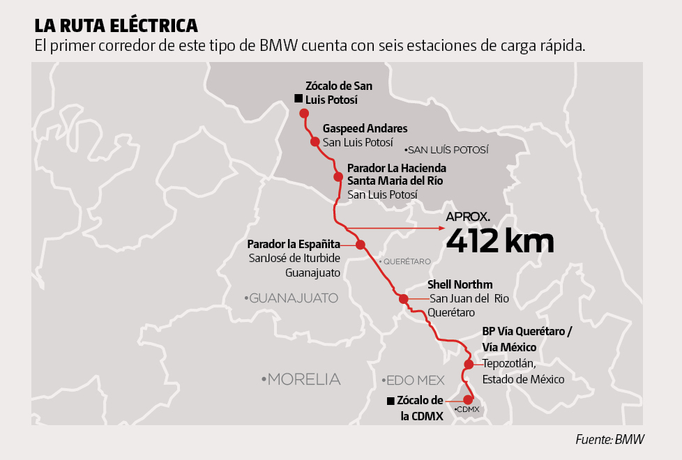 Hasta hace un par de meses, recorrer 400 kilómetros en un vehículo eléctrico o híbrido en carretera era algo impensable en México. La falta de infraestructura y la inminente posibilidad de quedar varado a mitad del camino hacía que los propietarios de estos vehículos los dejaran en la cochera de sus casas, hasta que BMW inauguró su primer corredor eléctrico de la Ciudad de México a San Luis Potosí en mayo pasado.