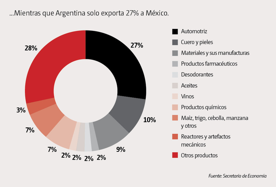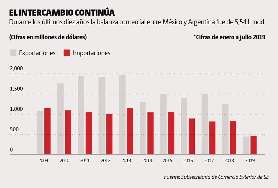 En los hechos, se trata de un monto muy superior al comercio real: Argentina exportó a México alrededor de 10,000 vehículos el año pasado, mientras que desde México llegaron una amplia variedad de modelos, desde el nuevo Volkswagen Vento hasta versiones de Honda y Nissan, tras la devaluación del peso argentino las importaciones cayeron abruptamente. Al finalizar 2018, las importaciones desde el país azteca habían caído 21.7%, respecto al año anterior, mientras que las exportaciones se habían derrumbado 30.6%, con un saldo a favor de México por 443 mdd.