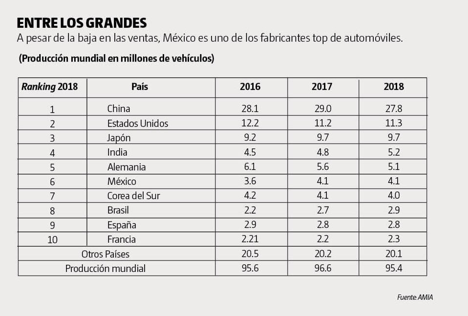 En 2018, México cerró como el sexto productor mundial de vehículos, solo detrás de China, EU, Japón, India y Alemania. Entre enero y diciembre, en el país se ensamblaron 3,242 millones de unidades, 2.6% por debajo de las unidades producidas en el mismo periodo de 2018.