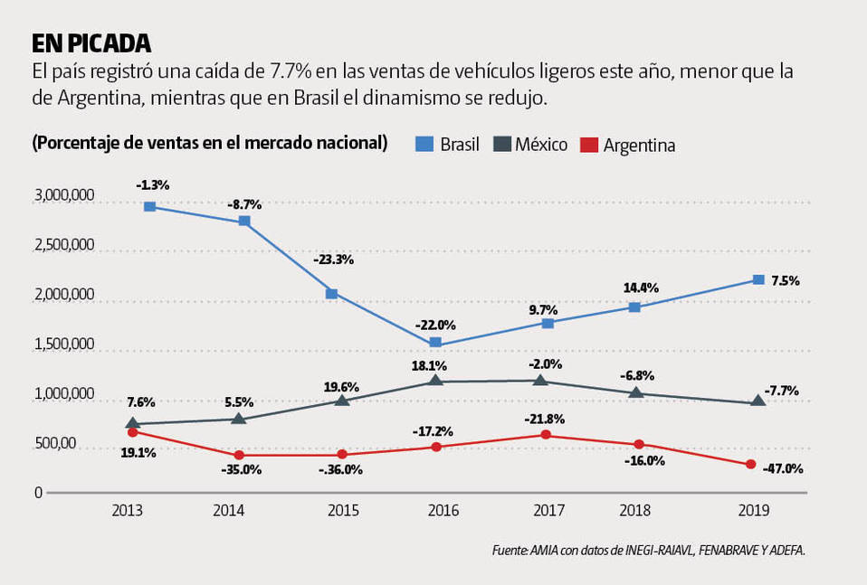 En cuanto a las ventas, la Asociación Mexicana de Distribuidores de Automotores (AMDA) reportó una pérdida de 8.9% en el mismo periodo, principalmente en deportivos (-25.5%); subcompactos (-14.1%) y de lujo (-11.1%). Pero, ¿qué tan grave es la situación? De acuerdo con la industria, se espera que en 2020 estas cifras se estabilicen y las caídas no sean tan drásticas. “Aún hay factores que causan preocupación en el mercado”, dice Guillermo Rosales, director adjunto de la AMDA, que prevé ventas totales inferiores a 1,400,000 vehículos este año.