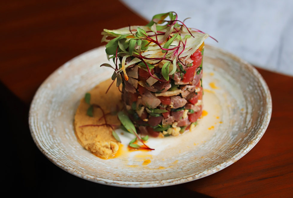 Su carta de postres también tiene esas creaciones originales con acento mexicano como la crême brûlée al mole, preparado con mole poblano y chile chilhuacle en una base de pan de elote, acompañado de salsa de vainilla con especias; y el tiramisú de aguacate, un biscocho de almendra y mousse de aguacate, bañado con jarabe de café de olla y mezcal.