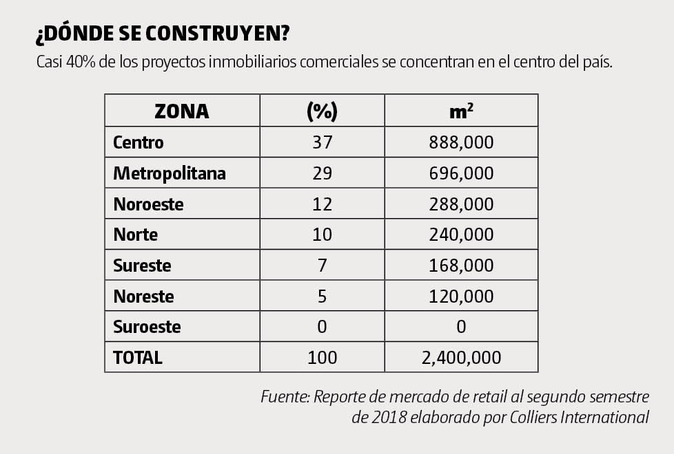 En diciembre de 2018, el inventario de centros comerciales en México ascendió a 786 inmuebles, esto significa una superficie rentable superior a los 23.9 millones de m2, dentro de siete zonas del país en las que Colliers International realiza el análisis del mercado: centro, metropolitana, norte, noreste, noroeste, sureste y suroeste.