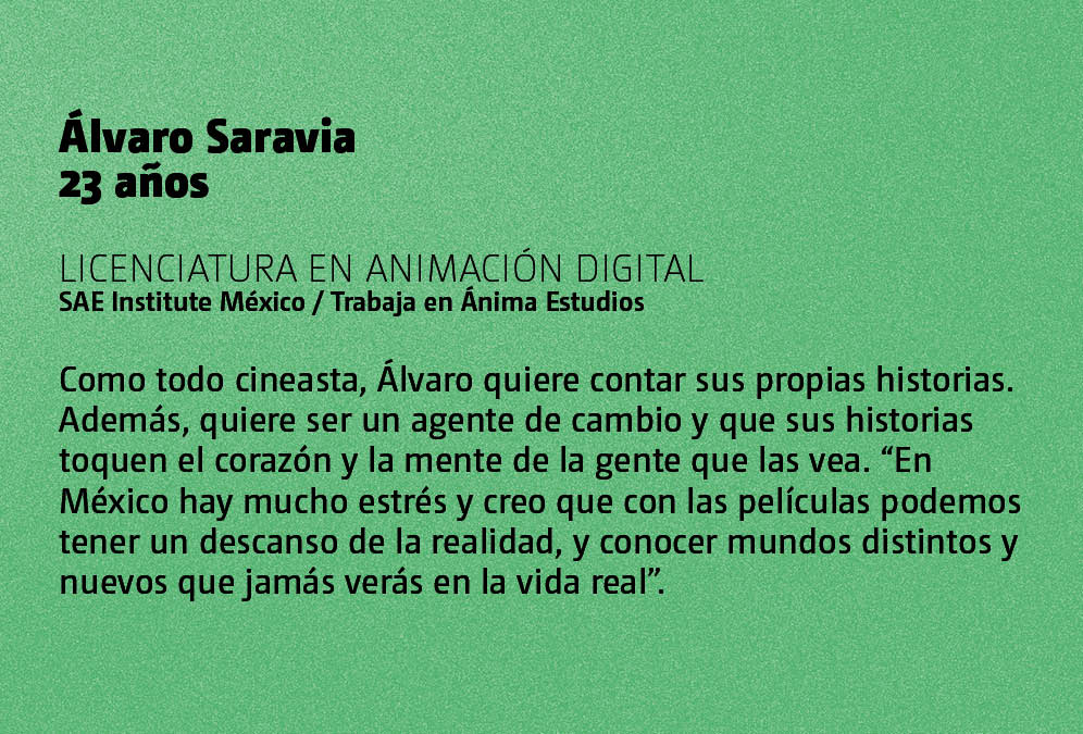 Desde que entró a trabajar en Ánima Estudios -una de las productoras de animación más importantes en México- hace alrededor de un año, Álvaro ha pasado por varias áreas y ha colaborado en diversos proyectos, en sus distintas etapas de producción y post producción. Pero lo que más le gusta es animar en 3D, así que dedica su tiempo libre a perfeccionar su técnica, que es el vehículo con el que, en un futuro, contará sus propias historias. Un universo tridimensional Creatividad. Contar historias para generar el cambio que soñamos.