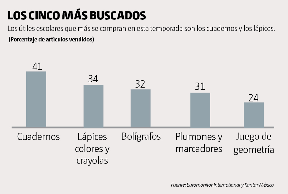 De acuerdo con la consultoría de mercados Kantar México, la categoría de mayor alcance en los hogares del país son los cuadernos, con 73%; la segunda corresponde a los bolígrafos y lápices con 61 y 57%, respectivamente.