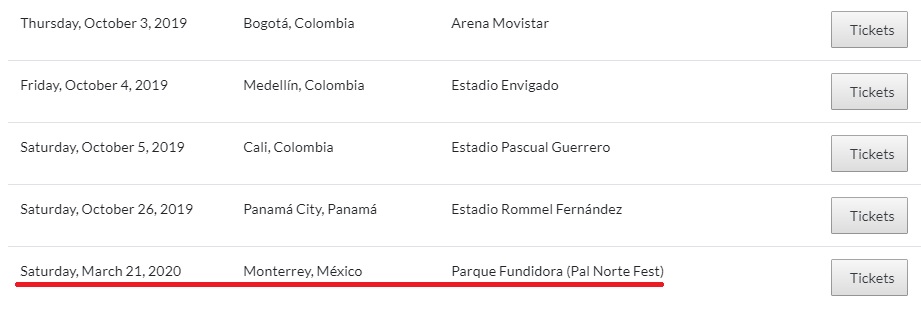 El cantante reveló las próximas fechas de su gira por el mundo, entre las cuales sólo aparece una para el 2020, cuando el 21 de Marzo se presente en el Parque Fundidora.