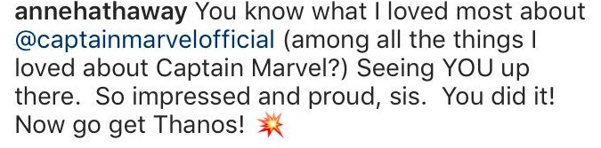 Al ver la publicación, Anne Hathaway decidió dejarle un comentario en donde expresa su admiración por Capitana Marvel y por Larson.