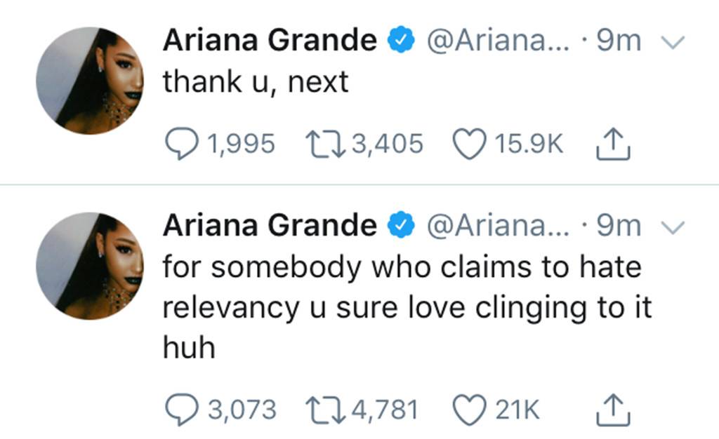 “Para alguien que dice odiar la relevancia, te encanta aferrarte a eso” escribió Grande en un primer mensaje seguido de “Gracias, el que sigue”.