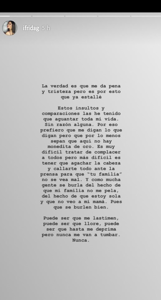 “Mucha gente se burla del hecho de que mi familia no me pela, del hecho de que estoy sola y que no veo a mi mamá”, dijo la hija de Alejandra Guzman.