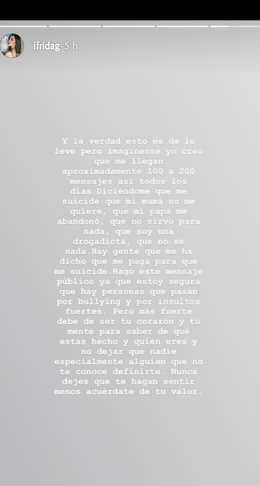 “Me llegan aproximadamente 100 a 200 mensajes así todos los días diciéndome que me suicide, que mi mamá no me quiere, que mi papá me abandonó, que no sirvo para nada, que soy una drogadicta”, acusó en otra historia.