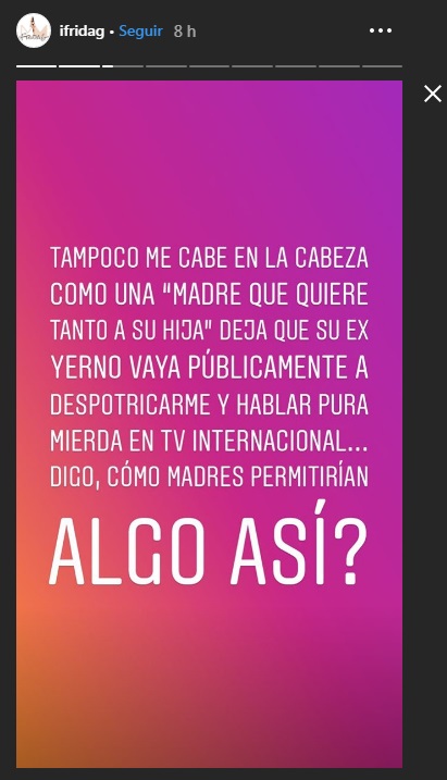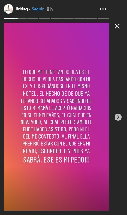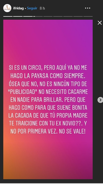 “No necesito cagarme en nadie para brillar, pero ¿qué hago como para que suene bonita la cagada de que tu propia madre te traicione con tu ex novio?”, continuó Frida quien se despidió de ella.