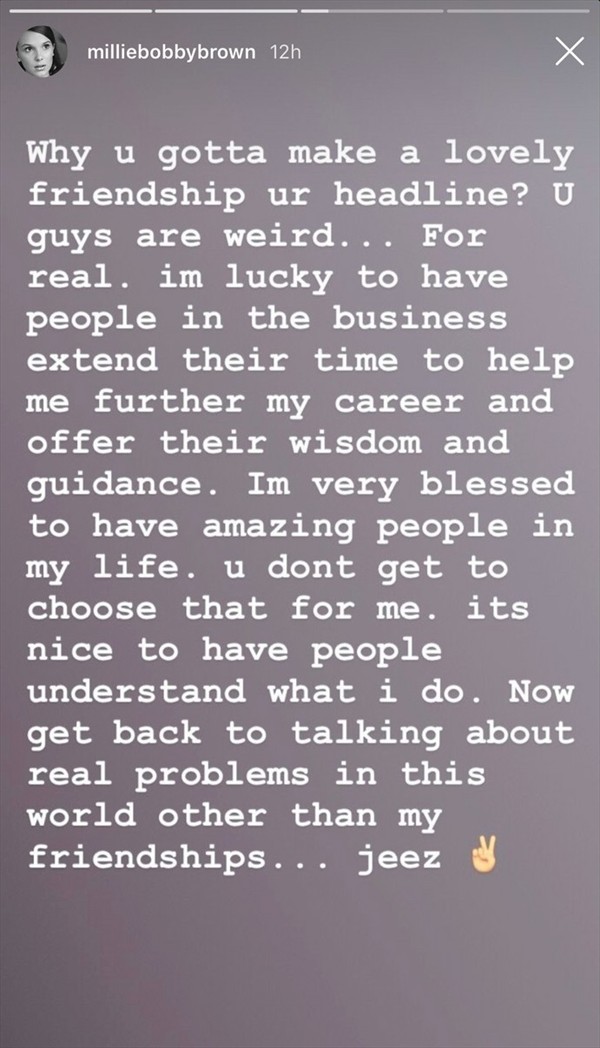 Tras las declaraciones, a través de las redes sociales se desató una discusión acerca de la amistad entre Millie y Drake, por lo que la actriz escribió unos mensajes a sus seguidores de Instagram.