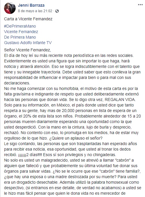 "El motivo de esta carta es por la falta gravísima e indignante de respeto que usted deliberadamente externó hacia las personas que donan vida. Se lo digo otra vez, REGALAN VIDA.", dijo en la misiva.