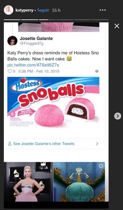 Las risas no pararon ahí, a través de sus historia de Instagram, la intérprete de Fireworks compartió algunas fotos de los memes que más le gustaron. Uno de ellos es el de una marca de pastelillos que tienen una cobertura del mismo tono del vestido que usó.