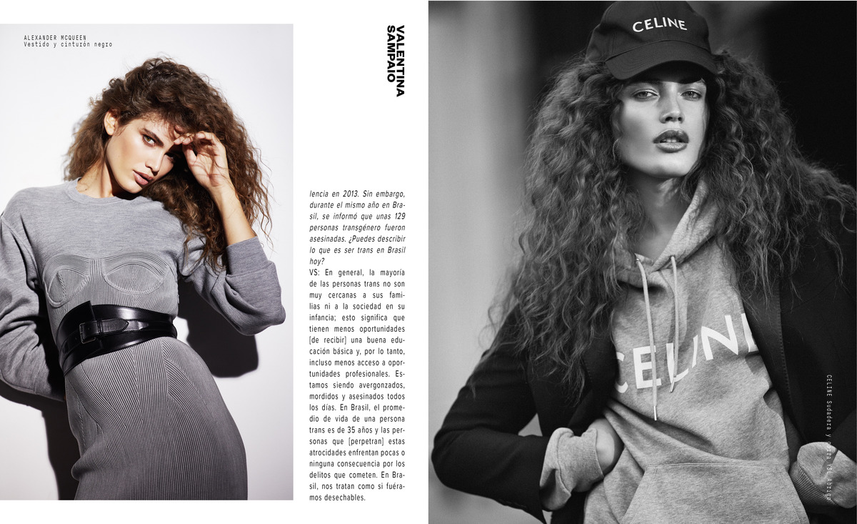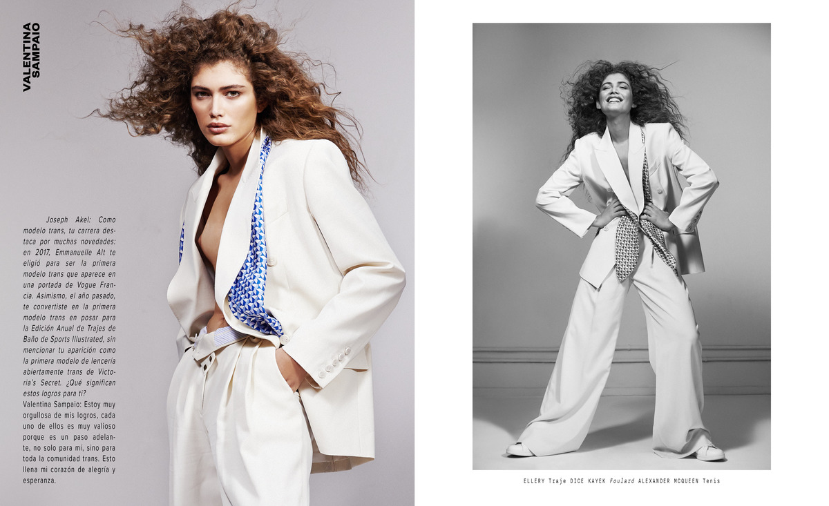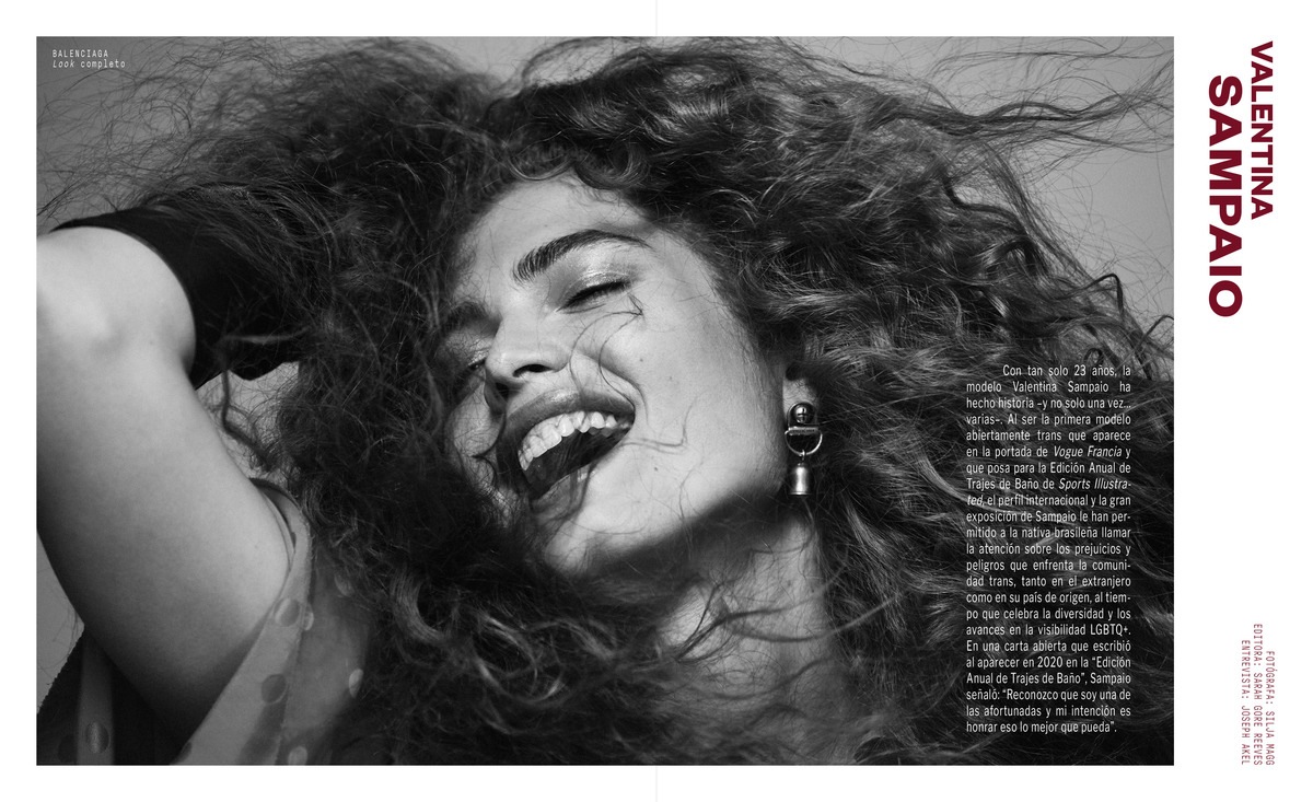 Con 24 años, la también actriz brasileña Valentina Sampaio ha hecho historia –no solo una vez... varias–. Su perfil internacional y su gran exposición le han permitido llamar la atención sobre los prejuicios y peligros que enfrenta la comunidad trans, tanto en el extranjero como en su país de origen, al tiempo que celebra la diversidad y los avances en la visibilidad LGBT+. En una carta abierta que escribió en 2020, al aparecer en la edición anual de trajes de baño de la revista Sports Ilustrated, Sampaio señaló: “Reconozco que soy una de las afortunadas y mi intención es honrar eso lo mejor que pueda”.