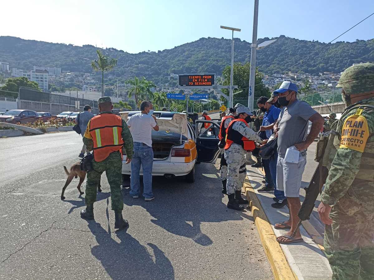 Durante la instalación del puesto de revisión en la carretera Escénica en la zona turística de Acapulco, se revisaron taxis y vehículos particulares, donde los binomios caninos participaron activamente.