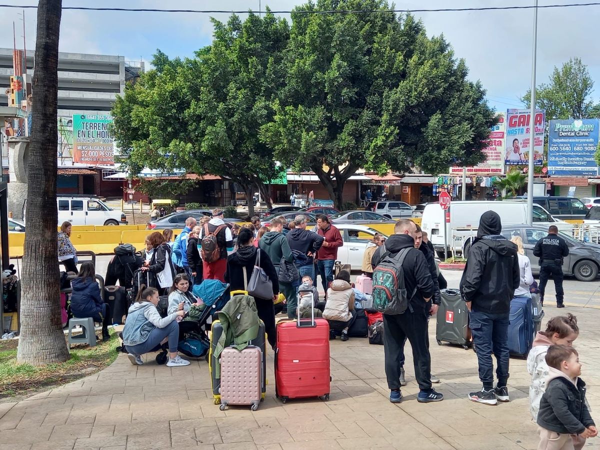 Algunos utilizaron la estación Garita Puerta México del Sistema Integral del Transporte Tijuana (SITT) para esperar. Cómo asiento usan sus maletas y sillas plegables.