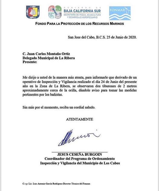 "Señor Juan Carlos Montaño Ortiz, Delegado Municipal de la Ribera, me dirijo a usted de la manera más atenta, para informarle que derivado de un operativo de inspección y de vigilancia, realizado el pasado miércoles 24 de junio del presente año en la zona de la Ribera, se observó la presencia de dos tiburones, cerca de la orilla de la playa, dando el aviso para tomar las precauciones pertinentes para los bañistas…”, dice el comunicado, el cual está firmado por Jesús Ceseña Borbón, Coordinador del Programa de Ordenamiento Inspección y Vigilancia del Municipio de Los Cabos.