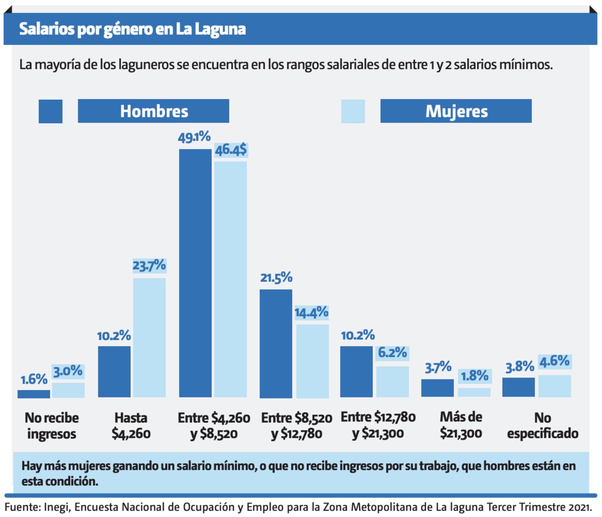 En la Zona Metropolitana de La Laguna, al tercer trimestre del 2021, la mayoría de los laguneros se encontraba en los rangos salariales de entre 1 y 2 salarios mínimos, que en ese entonces estaba en los 142 pesos (173 en el 2022), de acuerdo a los datos del Inegi recabados por el Consejo Cívico de las Instituciones Laguna (CCI).
